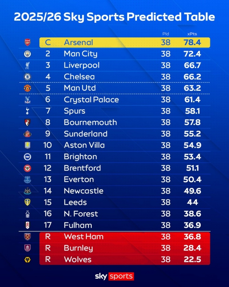 天空體育預測本賽季英超最終排名(積分為模擬10萬次的平均值)