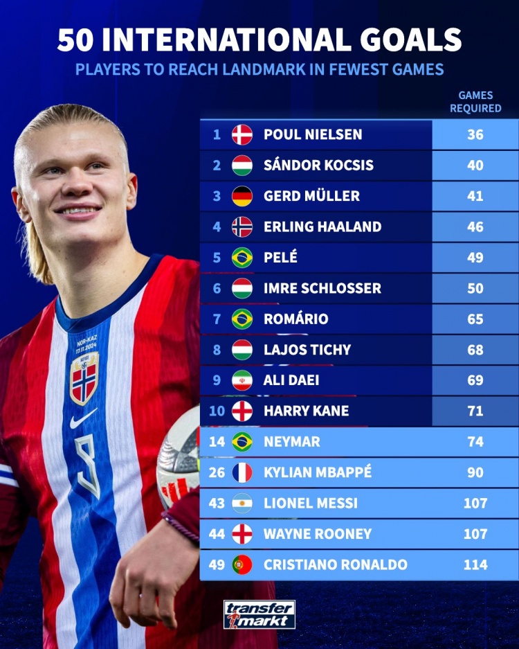 10月13日訊 在上周對(duì)陣以色列的世預(yù)賽中,哈蘭德上演帽子戲法,這讓他成為歷史上第4快打入國(guó)家隊(duì)第50球的球員。作為對(duì)比,梅西用了107場(chǎng)才達(dá)到這一里程碑,而C羅則用了114場(chǎng)。德轉(zhuǎn)列出了達(dá)成國(guó)家隊(duì)50球所用場(chǎng)次最少的球員?。