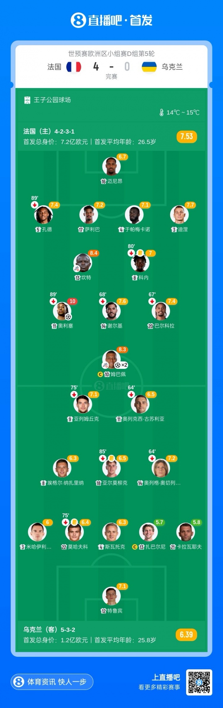 11月14日訊 世預(yù)賽歐洲區(qū)小組賽D組第5輪,法國4-0完勝烏克蘭,提前鎖定世界杯席位。34歲的坎特首發(fā)擔(dān)任中場,依舊發(fā)揮完美,無處不在。