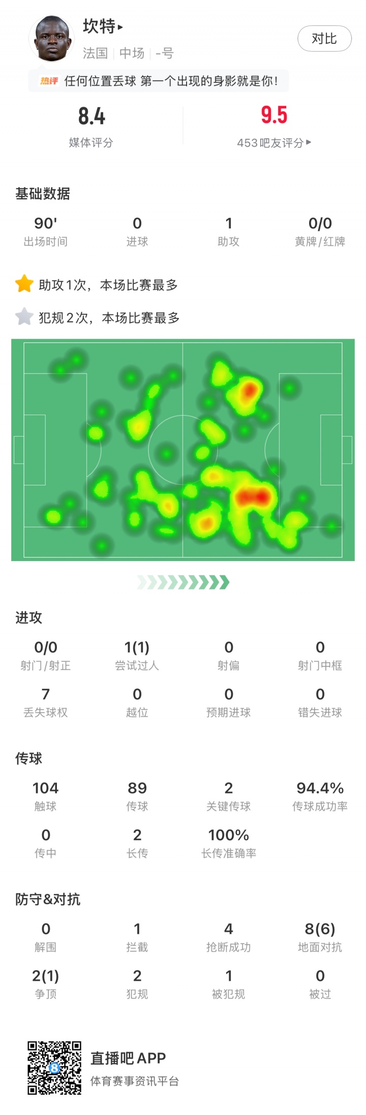 本場比賽,坎特送出1記助攻,1次過人成功,104次觸球,僅7次丟失球權(quán),傳球成功率近95%,防守方面還有6次對抗成功、1次爭頂成功、1次攔截以及4次搶斷。