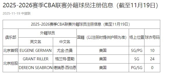 11月19日訊 今天CBA官方更新了2025-26賽季外籍球員注冊信息表。其中,北控注冊了格蘭特·里勒和德瑞恩·西伯恩;北京注冊了尤金·杰曼。此前,北控男籃官方發(fā)出公告,俱樂部相繼與外籍球員格蘭特·里勒、德瑞恩·西伯恩、雷吉納德·佩里就簽約事項達成一致。