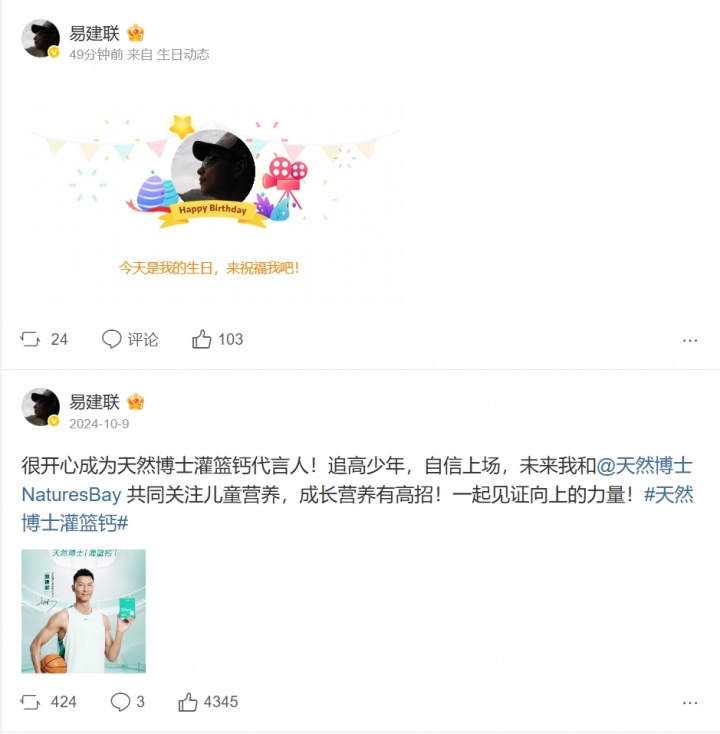 去年的生日期間易建聯(lián)并未更新相關(guān)生日動(dòng)態(tài)。10月27日,易建聯(lián)迎來(lái)個(gè)人的38歲生日。