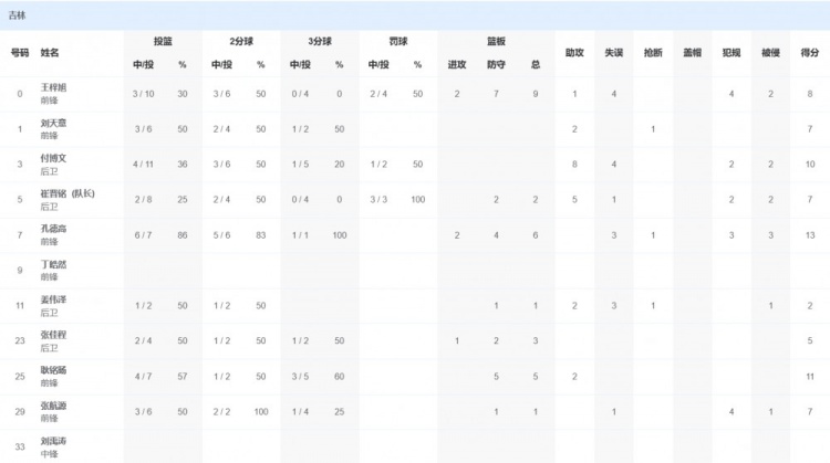 吉林隊(duì)方面,耿銘旸11分5籃板2助攻,孔德高13分6籃板1搶斷,付博文10分8助攻,崔晉銘7分2籃板5助攻。