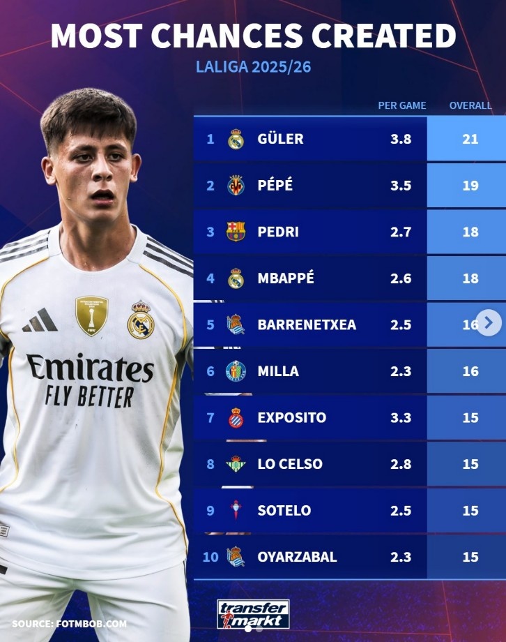 9月30日訊 德轉(zhuǎn)盤(pán)點(diǎn)了本賽季西甲創(chuàng)造機(jī)會(huì)榜單,其中居勒爾共計(jì)21次創(chuàng)造機(jī)會(huì)居首,具體如下(場(chǎng)均數(shù)據(jù)+總數(shù)據(jù)):