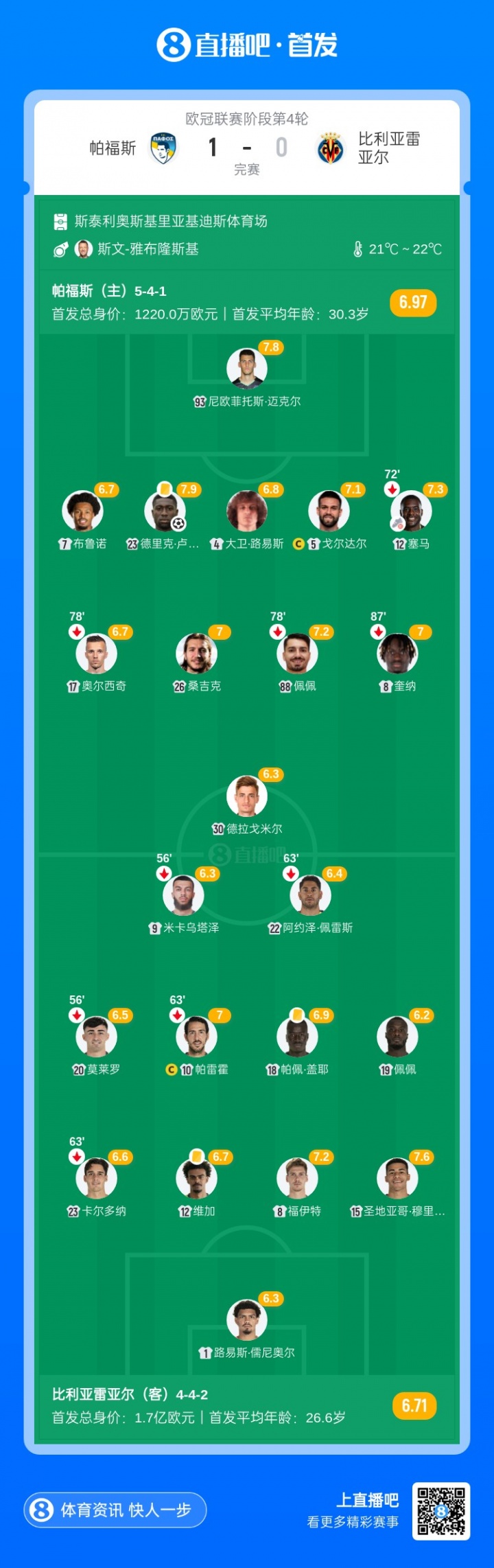 在西甲聯(lián)賽黃潛絕非弱旅,他們目前在國(guó)內(nèi)聯(lián)賽排名積分榜第3,僅次于皇馬和巴薩。更值得一提的是,本場(chǎng)歐冠帕福斯排出的首發(fā)陣容11人身價(jià)總和僅1220萬(wàn)歐元,而黃潛本場(chǎng)的首發(fā)身價(jià)達(dá)到了1.7億歐元,約為對(duì)手的14倍。