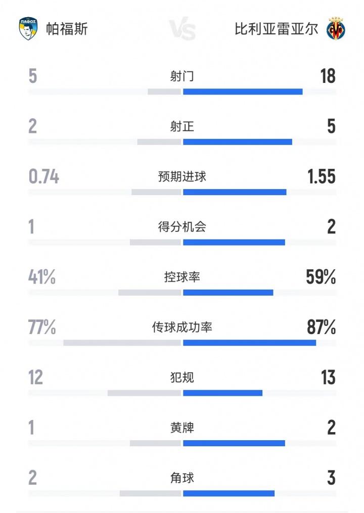 而無(wú)奈成為背景板的比利亞雷亞爾本場(chǎng)比賽在數(shù)據(jù)上占據(jù)絕對(duì)優(yōu)勢(shì),幾乎在所有的統(tǒng)計(jì)數(shù)據(jù)上都領(lǐng)先對(duì)手,但18腳射門(mén)、5次射正全都沒(méi)能轉(zhuǎn)化為進(jìn)球,反倒被帕福斯利用角球機(jī)會(huì)破門(mén)。