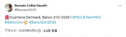 09月21日訊 法國記者Romain Collet Gaudin今日在社媒發(fā)文,表示今年金球獎得主就是登貝萊。該記者表示:“奧斯曼-登貝萊,2025年金球獎得主!”這位記者供職于多家法國正規(guī)媒體,有比較高的可靠度。金球獎頒獎典禮將于當(dāng)?shù)貢r間明天晚上舉行,雖然結(jié)果仍未揭曉,但大部分媒體都看好登貝萊。