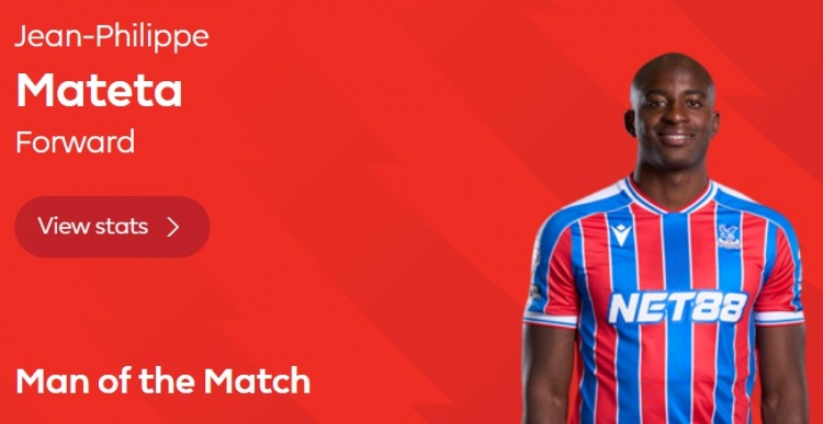 本場(chǎng)比賽水晶宮前鋒馬特塔上演帽子戲法,賽后他也當(dāng)選